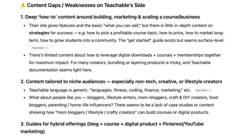 For this example, I asked ChatGPT to look at the content gaps for Teachable’s website.