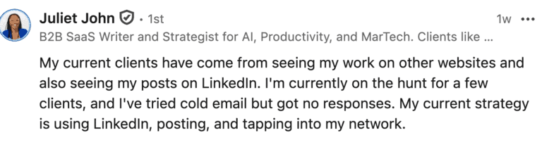 I like how she’s focussing on posting on LinkedIn and tapping into her network to find clients.