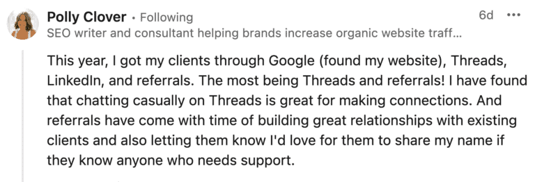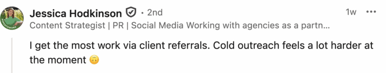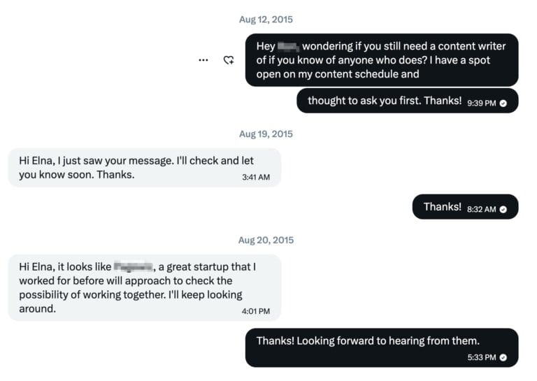 Referrals was something I still use and leaned on when I first started out. I remember asking one of my clients via X (aka Twitter) if they needed content still or had someone in mind.