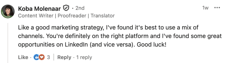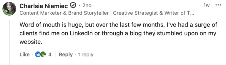 While LinkedIn is her main method for finding writing jobs, her blog is a close second.
